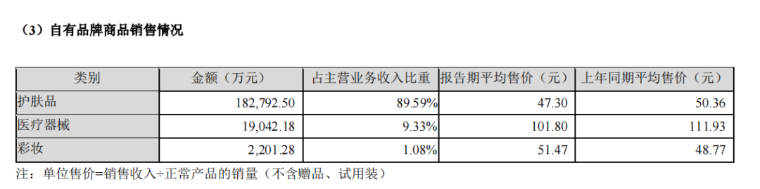 分類別看,貝泰妮主營業(yè)務(wù)(占比99.54% )中,護膚品、醫(yī)療器械、彩妝三類的銷售金額分別為18.27億元、1.90億元、0.22億元,占主營業(yè)務(wù)比重分別為89.59%、9.33%、1.08%。其中護膚品作為主營品類,其營業(yè)占比相比去年同期的89.09%進一步提升。醫(yī)療器械占比也相對有低于1%的小幅提升,彩妝占比則有所下滑。