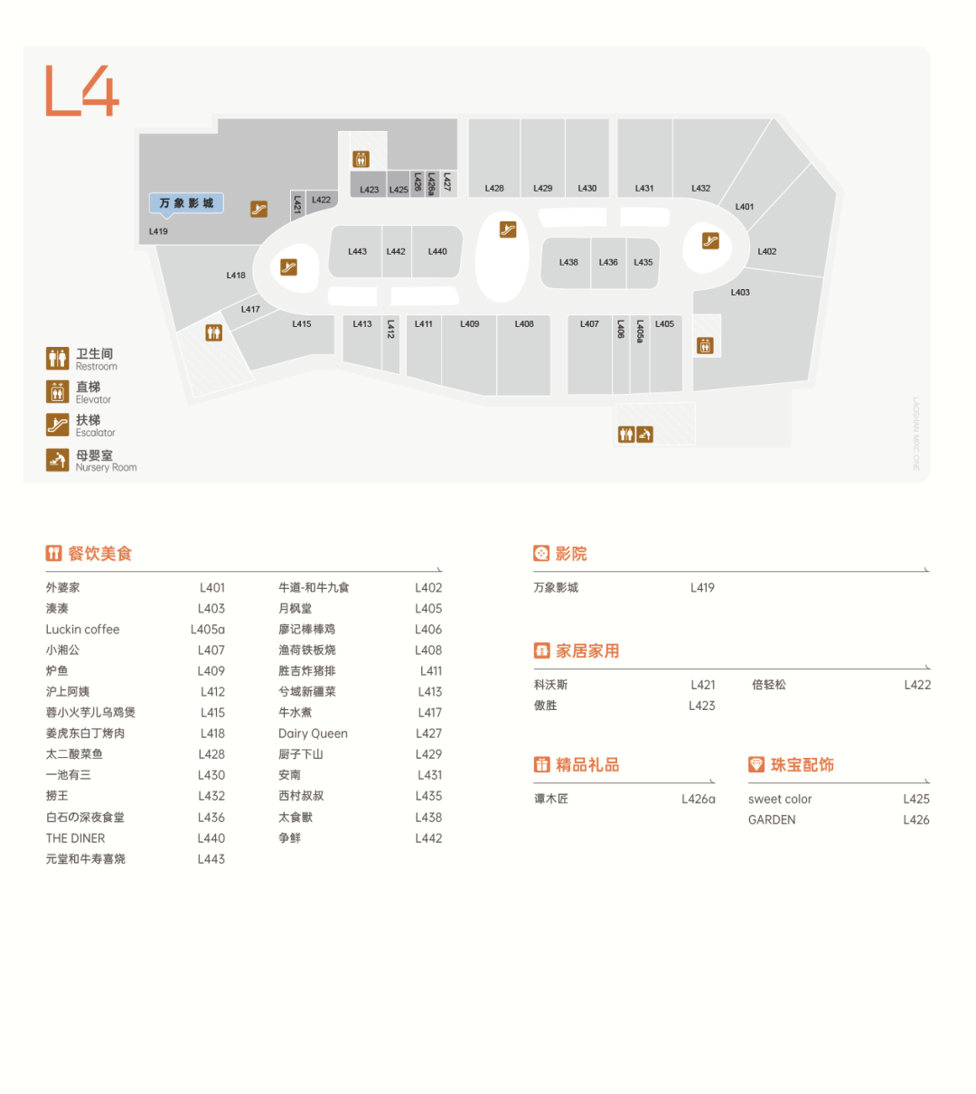 L4層北端為主力店萬象影城,附近有科沃斯掃地機器人、倍輕松、傲勝等家居家用品牌,以及部分配套業(yè)態(tài)。除此之外,均為餐飲門店。