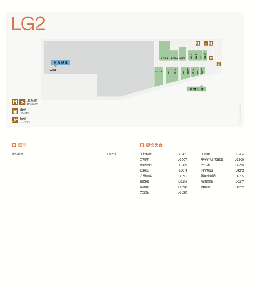LG2層包含兩大板塊——主力店盒馬鮮生煥新升級店,以及涵蓋米村拌飯、福前小酥肉、周黑鴨等輕簡餐+小吃品牌門店的美食公園。