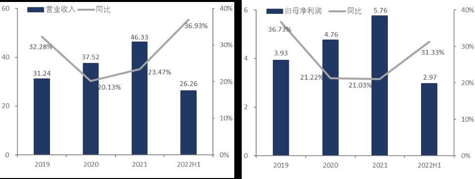 2019-2022H1珀萊雅營(yíng)收和凈利潤(rùn),單位:億元 資料來源:公司財(cái)報(bào),36氪