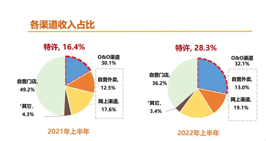 在各渠道收入占比中,2022年上半年,特許經營的占比已經提升至28.3%。同時,特許門店終端零售額提升了31.3%,貢獻出了3.34億元的營收。