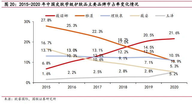 對“薇諾娜”依賴,造就了過去貝泰妮的高速成長。據(jù)國聯(lián)證券數(shù)據(jù),在2015年以前,雅漾、薇姿、理膚泉三大外資品牌在國內(nèi)皮膚學(xué)級護膚品市場上,市占率合計 57.6%,占據(jù)絕對主導(dǎo)地位。而彼時“薇諾娜”市占率僅有 6.8%。