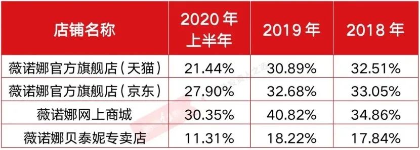 在渠道上,即便貝泰妮存在高度依賴線上渠道,而營銷費用率居高不下的問題,但一個值得注意的地方在于——其線上渠道主要是自營,如天貓旗艦店、專賣店等等,在主營業(yè)務(wù)收入比重中占到了60.69%。