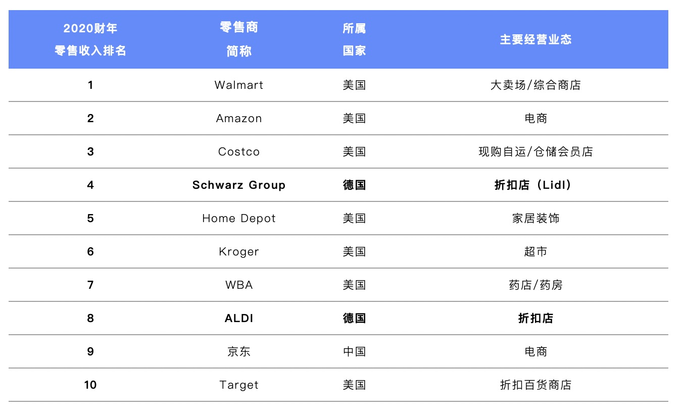 根據(jù)德勤《2022全球零售力量》報告,全球前十大零售商中,德國的Schwartz Group(旗下Lidl)和ALDI分別位列第四和第八,他們的主營業(yè)務是硬折扣超市。