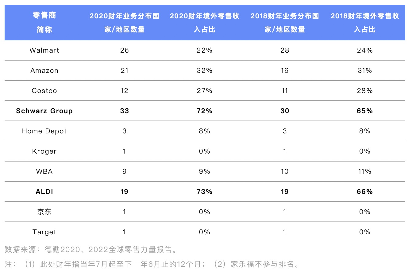 更有意思的是,從境外零售收入占比來看,Schwartz Group和ALDI在2020財年的這一占比從2018財年的65-66%攀升至72-73%,遠高于排名前三的Walmart、Amazon、Costco(約20-30%)。