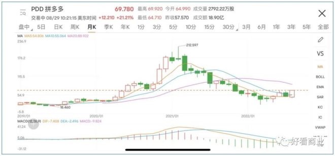 受強(qiáng)勁業(yè)績帶動,拼多多當(dāng)日在美股高開高走,盤中一度漲超21%,最終以14.71%的漲幅報收。