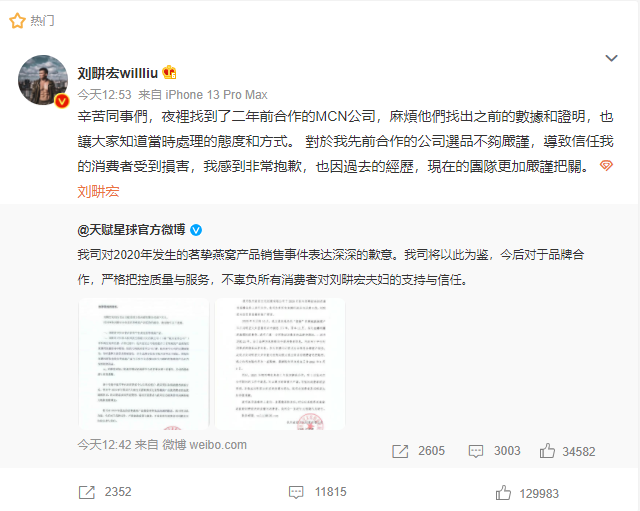 對(duì)此,8月31日午間,@劉畊宏willliu 發(fā)微博道歉,他表示昨天夜里找到了兩年前合作的MCN公司索要數(shù)據(jù)和證明,承認(rèn)因先前合作的公司選品不夠嚴(yán)謹(jǐn),導(dǎo)致信任自己的消費(fèi)者受到損害,未來一定會(huì)督促團(tuán)隊(duì)更加嚴(yán)謹(jǐn)。