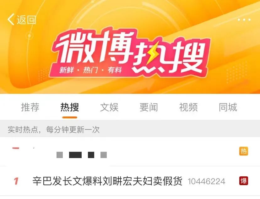 當(dāng)晚,“辛巴發(fā)長(zhǎng)文爆料劉畊宏夫婦賣假貨”的話題登頂微博熱搜榜單。