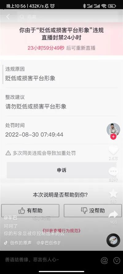 8月30日,有網(wǎng)友發(fā)現(xiàn)知名帶貨主播辛巴的某音賬號(hào)突然遭到平臺(tái)封禁24小時(shí),原因是由于“貶低與損害平臺(tái)形象”違規(guī)。