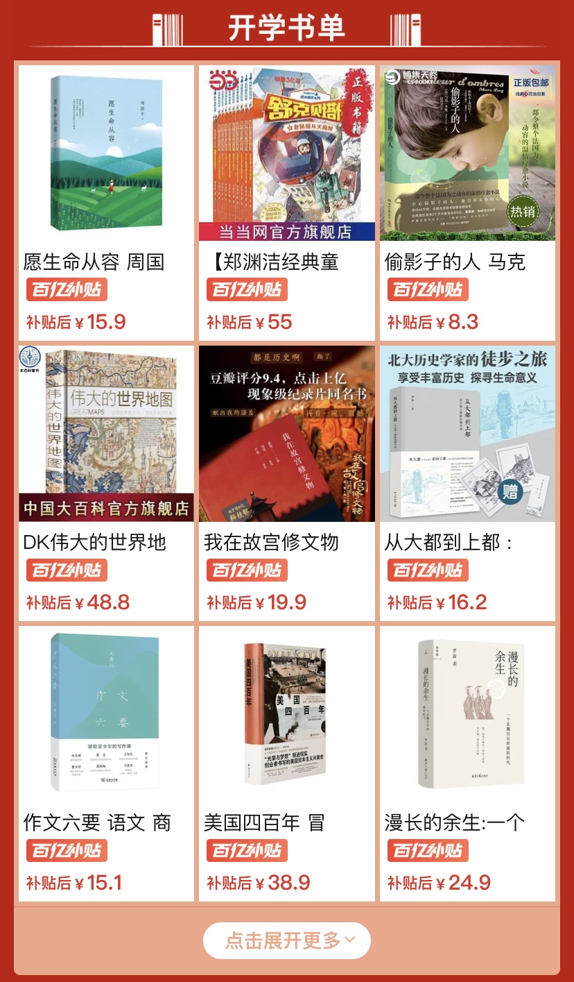 ▲ 9月1日起,第四季“多多讀書月”活動增設(shè)開學季補貼專區(qū),精選上百本工具教輔、童書繪本與經(jīng)典讀物。
