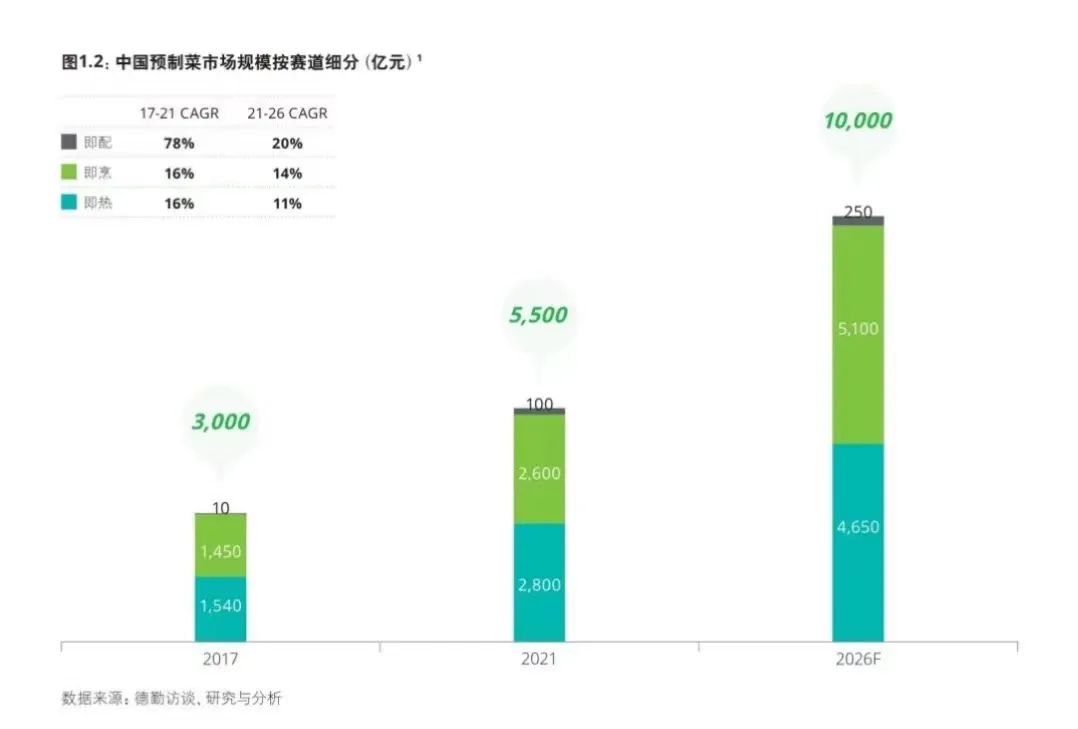 德勤中國(guó)與穆棉資本和內(nèi)向基金聯(lián)合發(fā)布《2022年預(yù)制菜市場(chǎng)展望》報(bào)告中表示,2021年中國(guó)預(yù)制菜市場(chǎng)規(guī)模約為人民幣5500億元,預(yù)計(jì)2026年將達(dá)到萬億市場(chǎng)規(guī)模。