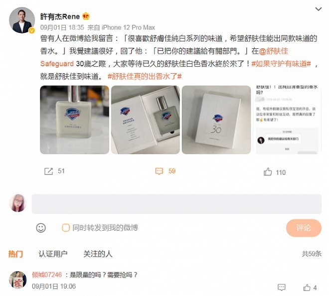 真正將舒膚佳香水的討論熱度推向高潮的,恐怕還是9月1日,寶潔大中華區(qū)傳播與公關(guān)副總裁許有杰在微博上的一條推文。許有杰在微博透露,3年多前就有粉絲建議舒膚佳推與香皂同款味道的香水,現(xiàn)借舒膚佳品牌30周年之際正式推出一款純白香味的香水。據(jù)了解,許有杰在微博擁有29.4萬粉絲。