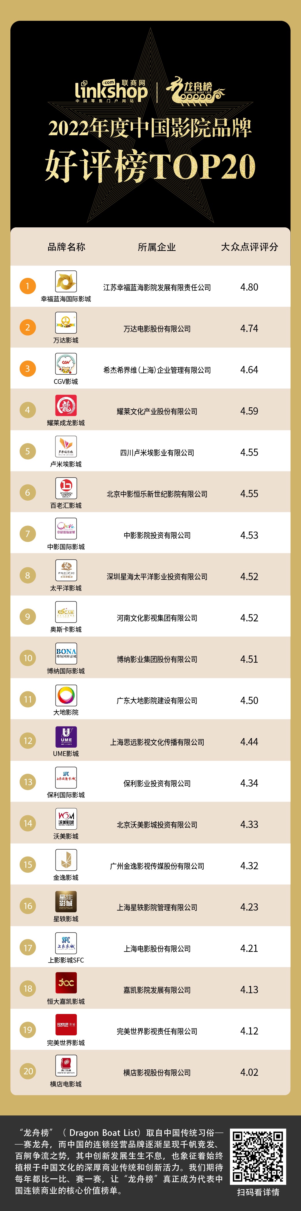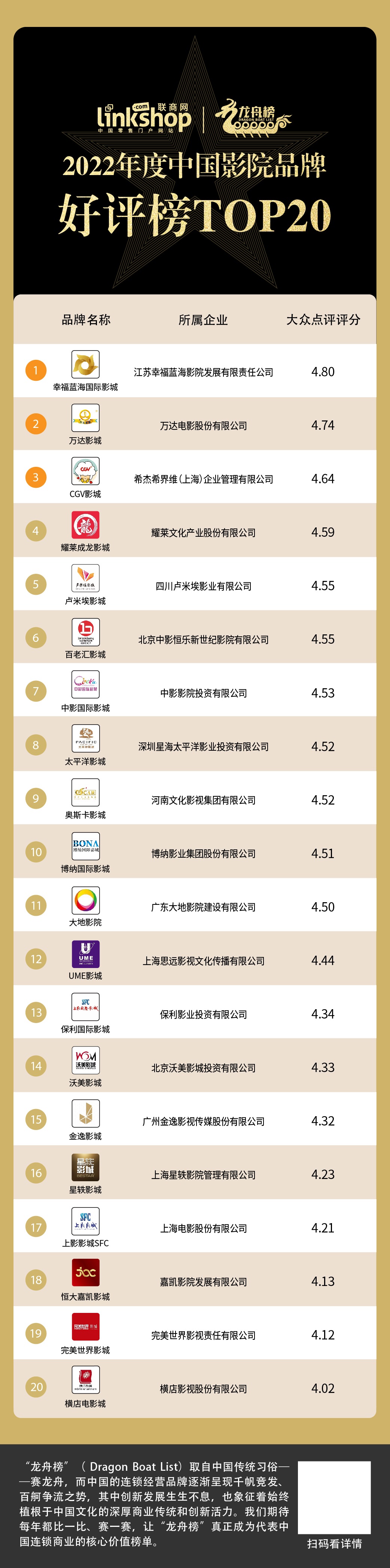 為此《聯(lián)商網(wǎng)》依據(jù)大眾點(diǎn)評評分,推出“2022年電影院連鎖品牌好評榜TOP20”。