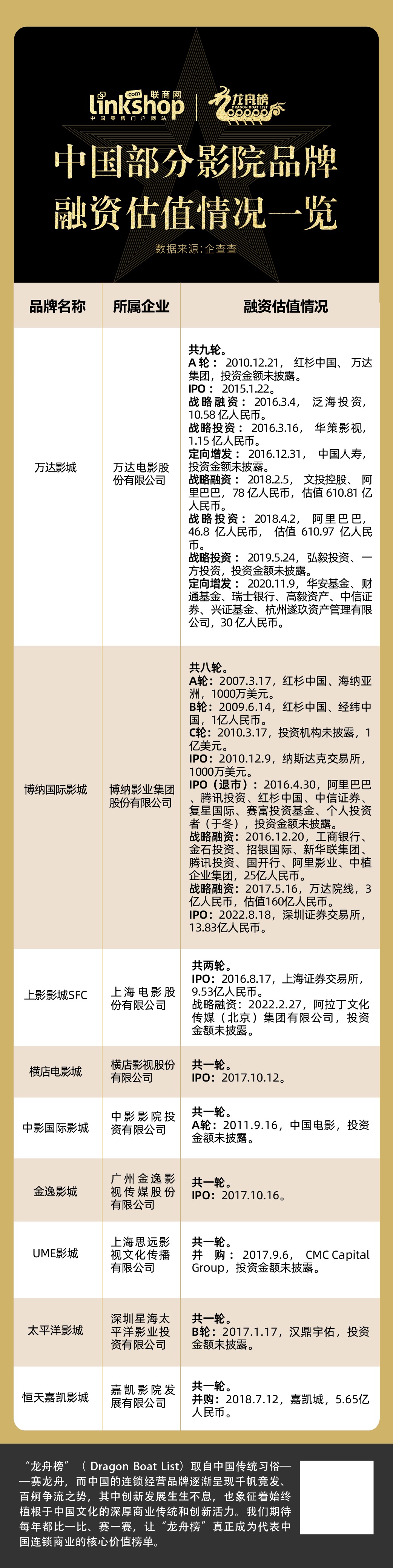 面對如此現(xiàn)狀,承載影院行業(yè)的實(shí)體影院有何表現(xiàn)?本期,《聯(lián)商網(wǎng)》特別推出龍舟榜之“2022年度電影院連鎖品牌TOP20”,從門店數(shù)據(jù)、消費(fèi)者滿意度、票房排行、融資情況四個(gè)維度對電影院連鎖品牌進(jìn)行分析觀察,呈現(xiàn)行業(yè)發(fā)展現(xiàn)狀,展望未來發(fā)展趨勢。