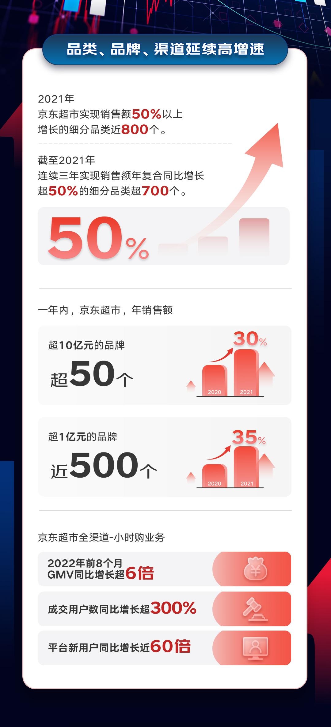 2021年,京東超市實(shí)現(xiàn)銷售額50%以上增長的細(xì)分品類近800個(gè);截至2021年,連續(xù)三年實(shí)現(xiàn)銷售額年復(fù)合同比增長超50%的細(xì)分品類超700個(gè)。