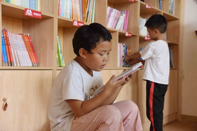(同學(xué)們?cè)趫D書室閱讀愛心企業(yè)捐贈(zèng)的圖書。攝:王夢(mèng)楠、董旭)