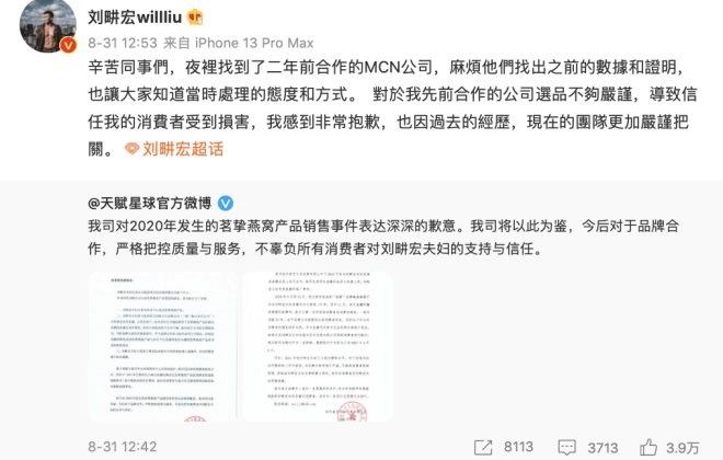 劉畊宏方面很快出來道歉,承認因公司選品不夠嚴謹,未來一定會督促團隊更加嚴謹,并澄清,當時的帶貨渠道不在抖音,而是在淘寶直播。