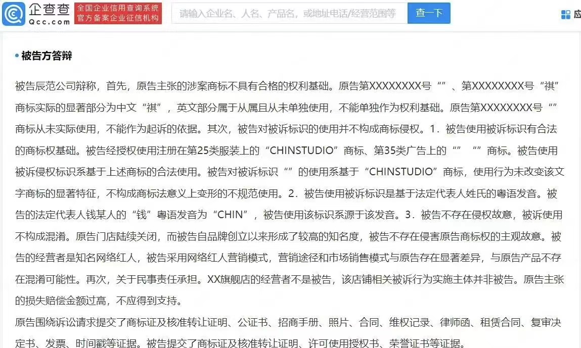 被告辰范公司辯稱,原告涉案商標(biāo)顯著部分為中文“祺”,英文部分不能單獨(dú)作為權(quán)利基礎(chǔ),且被告經(jīng)授權(quán)使用“CHINSTUDIO”商標(biāo)。同時(shí),被告法定代表人錢某人的“錢”粵語(yǔ)發(fā)音為“CHIN”,被告使用該標(biāo)識(shí)系源于該發(fā)音,被告采用網(wǎng)絡(luò)紅人營(yíng)銷模式,與原告產(chǎn)品不存在混淆可能性。