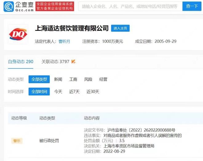 企查查APP顯示,DQ冰雪皇后關(guān)聯(lián)公司上海適達(dá)餐飲管理有限公司因涉虛假宣傳被行政處罰,處罰金額3.5萬(wàn)元,處罰單位為上海市奉賢區(qū)市場(chǎng)監(jiān)督管理局。