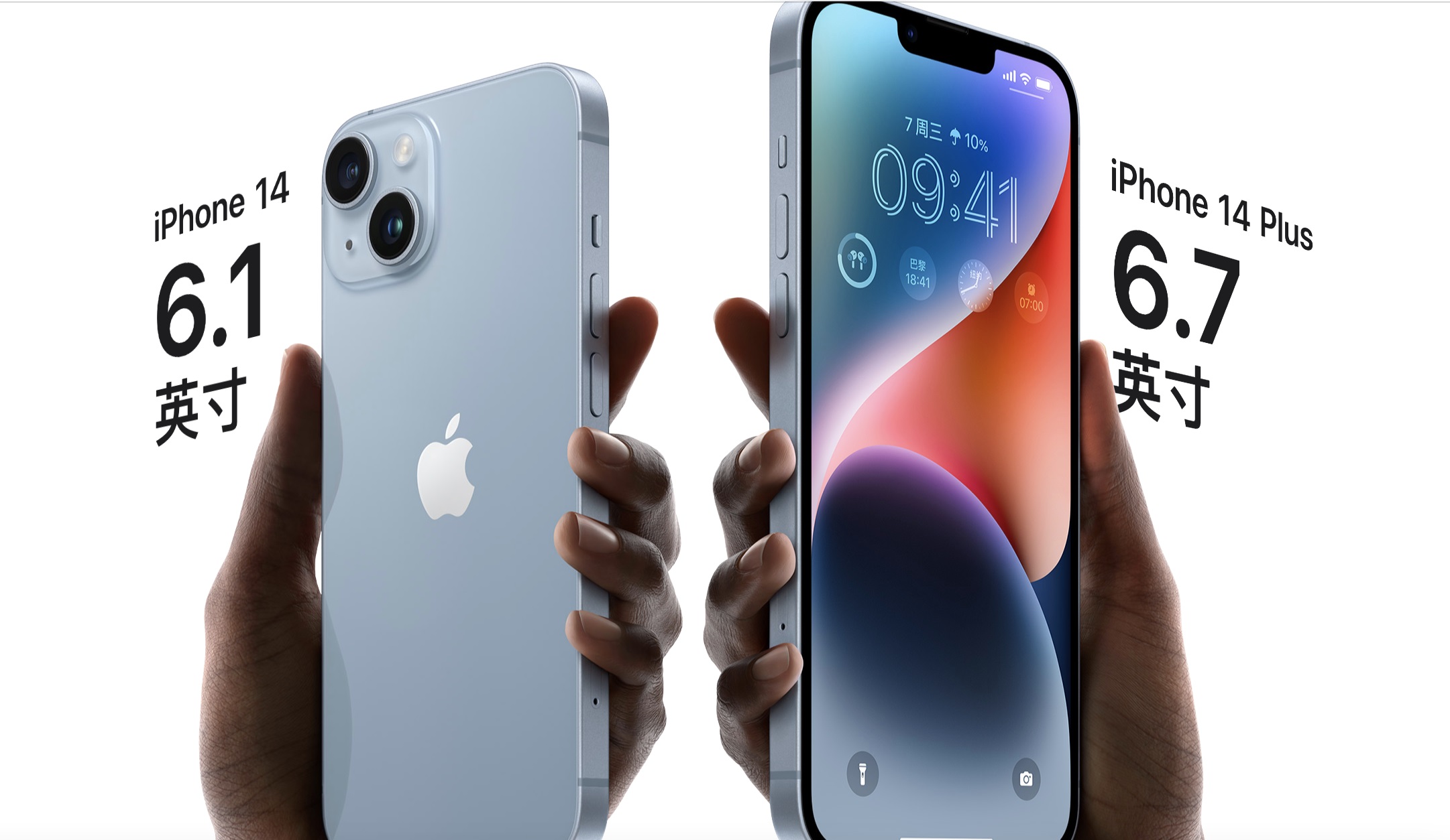 配色方面,iPhone 14/14 Plus有五種全新的配色可選,分別為紫色、藍色、午夜色、星光色和紅色。