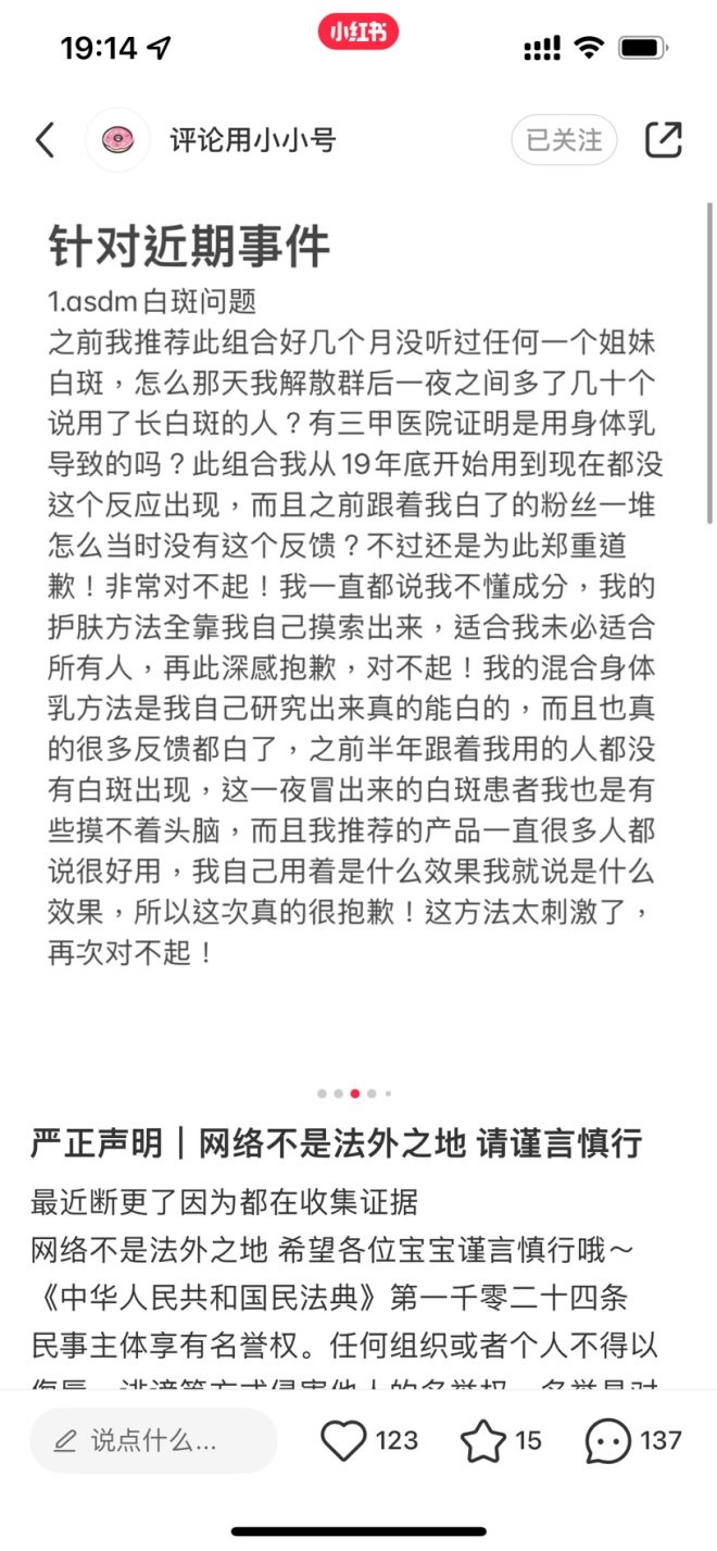 事后,上述10萬(wàn)粉絲美妝博主迫于壓力在小紅書公開道歉,稱自己“不懂成分,護(hù)膚方法都是自己摸索出來(lái)”“這個(gè)方法太刺激了”。但同時(shí),該博主也針對(duì)“奶皮Niko”等小紅書用戶發(fā)布了指控侵權(quán)的律師函。