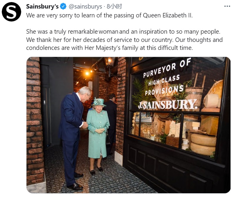 英國連鎖巨頭Sainsbury's在推特上寫道:“得知伊麗莎白二世女王去世的消息,我們感到非常遺憾。?她是一位真正了不起的女性,激勵了很多人。我們感謝她數(shù)十年來為國家服務(wù)。在這個艱難的時刻,我們與女王陛下的家人同在!