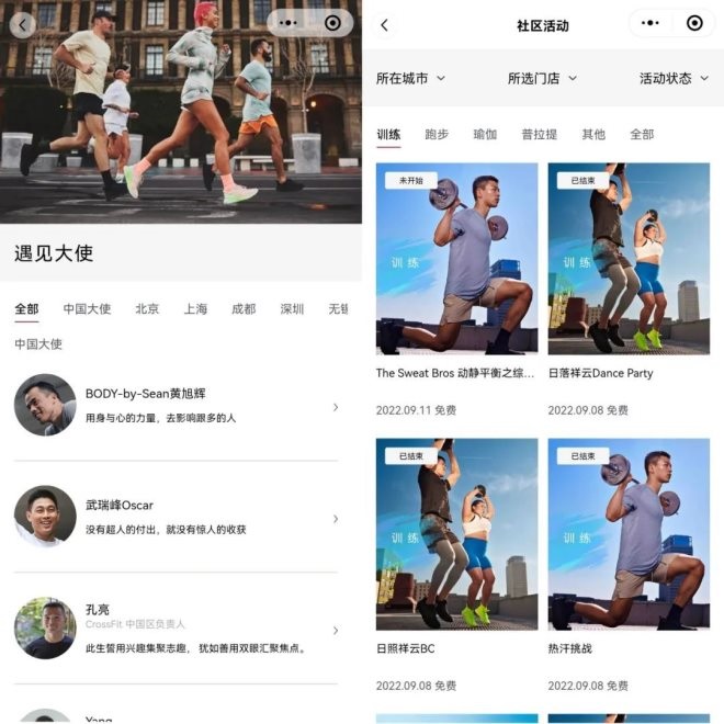 此前,lululemon通過(guò)各個(gè)門店在線下招募門店大使,這些門店大使是當(dāng)?shù)氐慕∩斫叹毢徒∩韾酆谜,而通過(guò)門店大使組織各類免費(fèi)的活動(dòng)推廣品牌與產(chǎn)品,又能達(dá)到社群傳播營(yíng)銷目的,增強(qiáng)消費(fèi)者的粘性和關(guān)注度。這樣的營(yíng)銷模式成本低,靠口碑效應(yīng)打破圈層,結(jié)合lululemon的線上端,能夠達(dá)到更好的傳播效果。