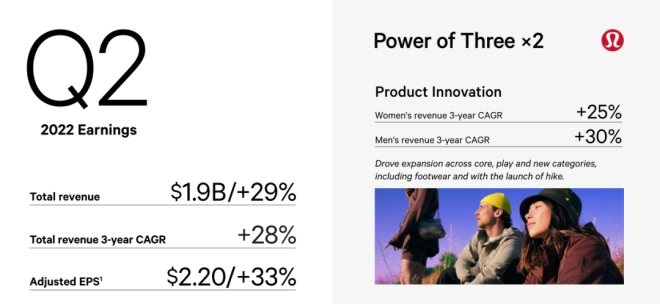 2022年二季度,lululemon男性業(yè)務(wù)增長(zhǎng)了27%,女性業(yè)務(wù)增長(zhǎng)了24%,配飾業(yè)務(wù)增長(zhǎng)了80%。