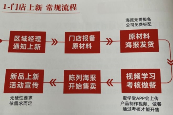 上文所說(shuō)的賣貨技巧實(shí)際是蜜雪冰城銷售的標(biāo)準(zhǔn)化動(dòng)作,而銷售標(biāo)準(zhǔn)化的前提是產(chǎn)品標(biāo)準(zhǔn)化和流程的標(biāo)準(zhǔn)化。