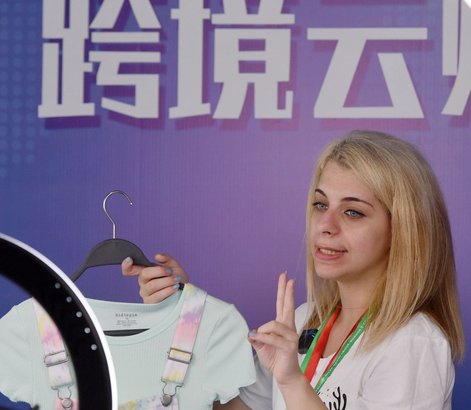 圖為在山東青島,一位國外主播在黃河流域跨境電商博覽會上帶貨直播。(圖片由CNSPHOTO提供)