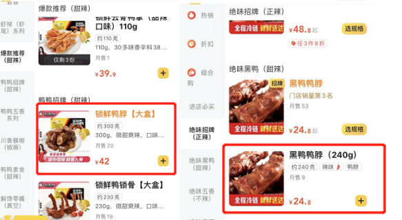 此外,以美團(tuán)外賣(mài)平臺(tái)為例,周黑鴨鴨脖300g包裝的價(jià)格為42元,而絕味鴨脖甜辣味,240g的價(jià)格為24.8元,大份330g的價(jià)格為33.8元,也低于周黑鴨的價(jià)格。