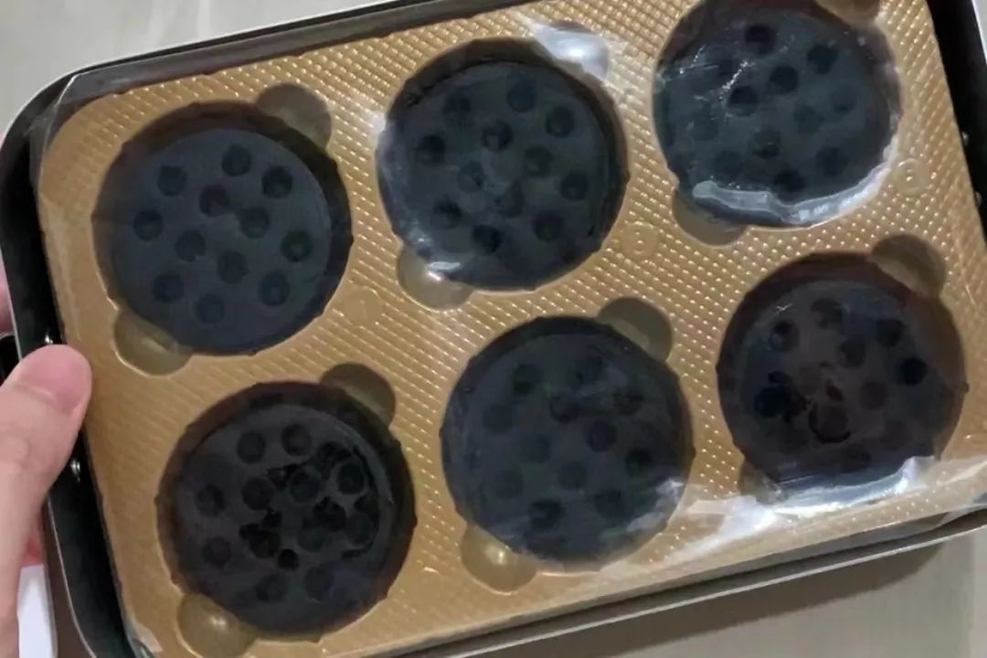 黑黢黢的月餅上面有標準的12個孔,干巴的裂紋看起來就更真實了,讓人琢磨不透到底是黑芝麻味兒還是巧克力味兒,網(wǎng)友戲稱此餅名為“煤毛餅”,還有人擔心會不會一氧化碳中毒。