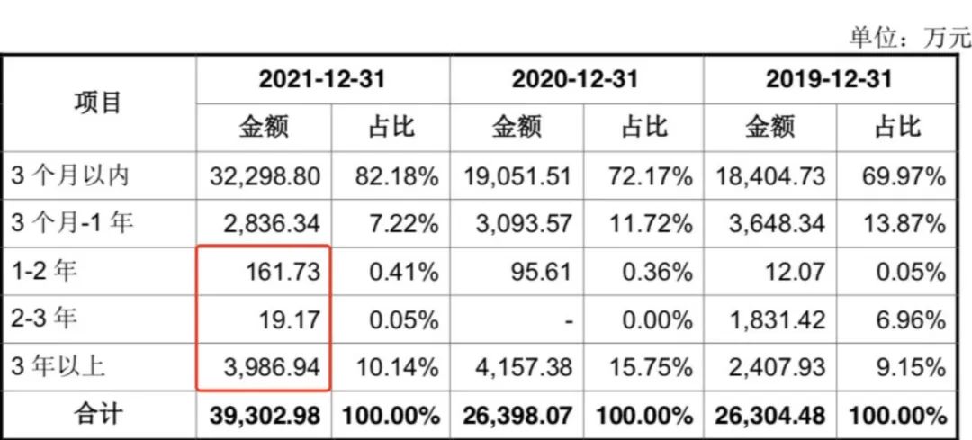 2019年末至2021年末,新巨豐的應(yīng)收賬款余額分別為2.63億元、2.64億元、3.93億元,占營(yíng)業(yè)收入比例分別為28.13%、26.02%、31.65%。2021年的增長(zhǎng),新巨豐認(rèn)為是業(yè)務(wù)增長(zhǎng)迅速所致。