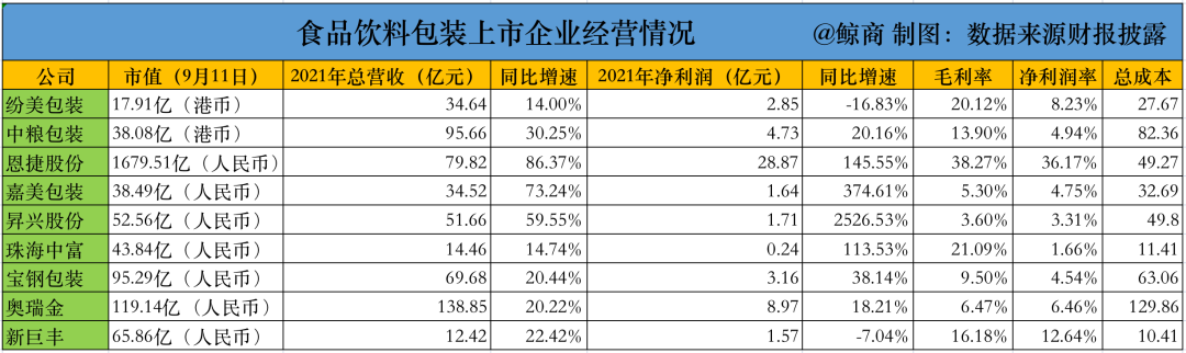 隨著國(guó)家對(duì)環(huán)保、衛(wèi)生等要求的提高,市場(chǎng)原材料成本的上升,沒(méi)有技術(shù)優(yōu)勢(shì)和資金優(yōu)勢(shì)的中小包裝企業(yè)的生存愈加困難,行業(yè)的產(chǎn)業(yè)集中度和頭部效應(yīng)會(huì)越來(lái)越明顯。鯨商整理了一批食品包裝行業(yè)的相關(guān)上市企業(yè),如下圖: