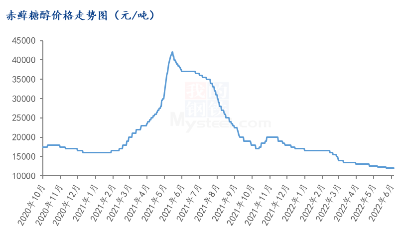相關(guān)數(shù)據(jù)也顯示,自去年5月中旬赤蘚糖醇價(jià)格達(dá)到4.25萬元/噸的高位后便一路下跌,目前市場價(jià)格處于1.3萬元/噸以下,逼近成本線。
