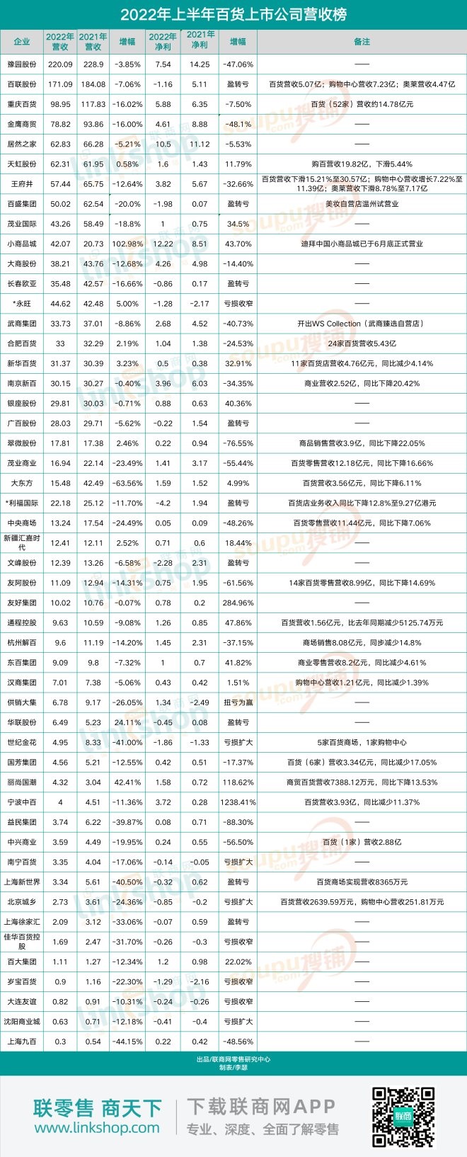 2022年上半年,百貨行業(yè)上市公司交出了怎樣的答卷,又有哪些發(fā)展新思路值得行業(yè)參考學(xué)習(xí),《聯(lián)商網(wǎng)》選取50家百貨上市企業(yè)上半年財報來一探究竟。