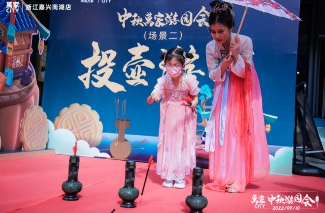 在浙江南湖,一場(chǎng)圓滿又熱鬧的中秋游園會(huì)在萬家旗下萬家CiTY溫情啟幕。市民可以在“花前月下共此食”,參加試吃點(diǎn)評(píng)集印章;也可以在“月朗清風(fēng)投壺去”,感受古代士大夫宴飲時(shí)的投擲游戲;還可以在“花好月圓猜燈謎”,一起在熱鬧歡慶中共度良宵……讓不少大孩子和小孩子們流連忘返,在萬家CiTY里逛得不亦樂乎。