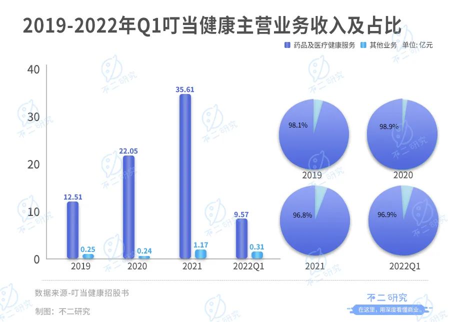 據招股書顯示,2019-2021年及2022年一季度,來自藥品及醫(yī)療健康業(yè)務的收入分別為12.51億、22.05億、35.61億和9.57億元,占總收入的98.1%、98.9%、96.8%和96.9%,據此前招股書顯示,2018年該項業(yè)務收入為5.62億元,同比增速分別為122.5%、76.2%、61.5%和70.18%。