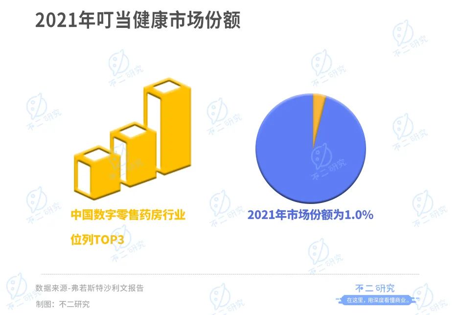叮當健康是一家通過開創(chuàng)線上至線下解決方式為主導的即時藥品零售及醫(yī)療咨詢平臺。其在招股書援引弗若斯特沙利文報告稱,按2021年收入計,其是在中國數字零售藥房行業(yè)中排名第三,市場份額為1.0%。