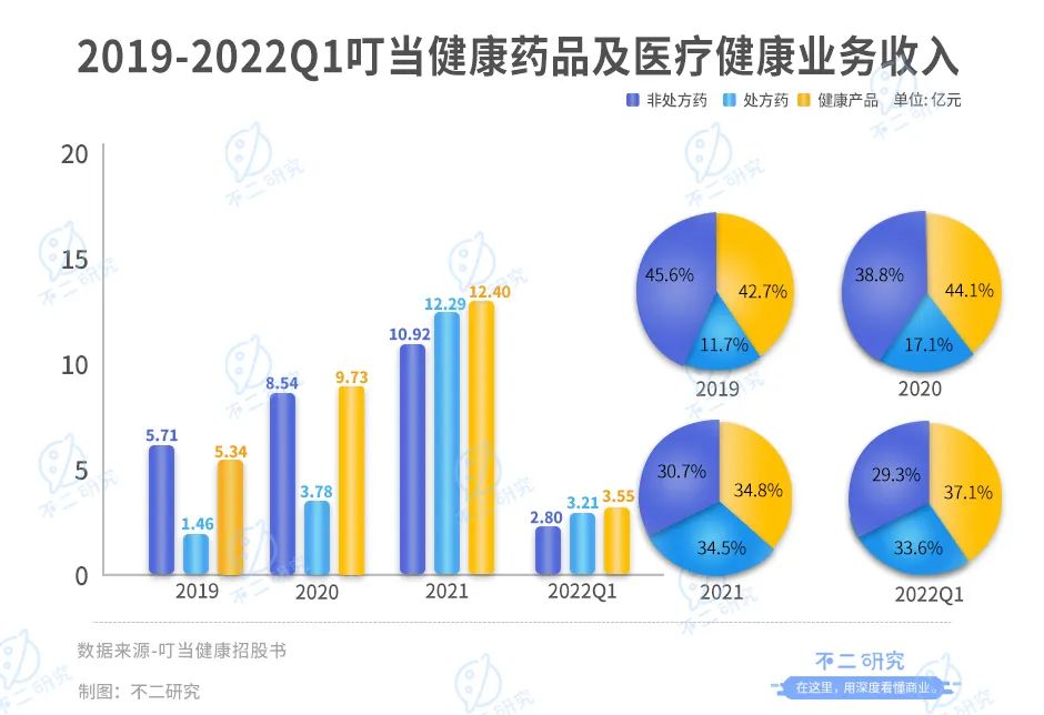 其中藥品及醫(yī)療健康業(yè)務又分為非處方藥、處方藥和健康產品。2019-2021年及2022年一季度,非處方藥的收入分別為5.71億、8.54億、10.92億和2.80億,在該項業(yè)務中占比45.6%、38.8%、30.7%和29.3%。處方藥的收入分別為1.46億、3.78億、12.29億和3.21億,在該項業(yè)務中占比11.7%、17.1%、34.5%和33.6%。健康產品的收入分別為5.34億、9.73億、12.40億和3.55億,在該項業(yè)務中占比42.7%、44.1%、34.8%和37.1%。
