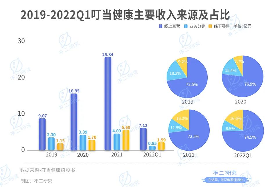 按渠道劃分,叮當健康的收入主要來源于線上直營、業(yè)務分銷和線下零售。