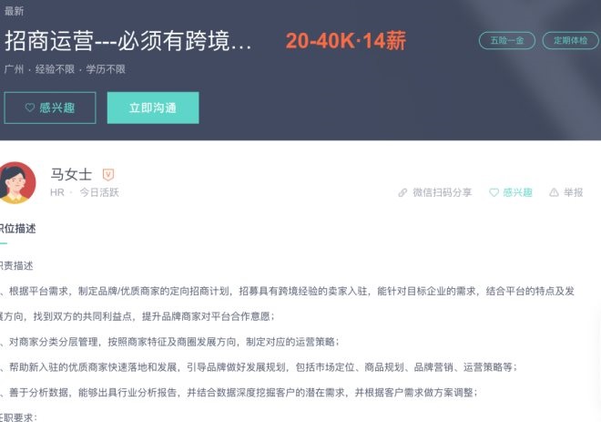 在來(lái)自拼多多的一些官方招聘信息中,地點(diǎn)為「廣州」的城市新增了很多崗位,比如「招商運(yùn)營(yíng)」一職,要求必須有跨境經(jīng)驗(yàn),比如「英文商品運(yùn)營(yíng)」,要求英語(yǔ)好,對(duì)全球文化感興趣,以及「跨境商家產(chǎn)品運(yùn)營(yíng)」,要有效輸出選品策略,綜合這些職位的具體描述,你會(huì)發(fā)現(xiàn)「男女裝、母嬰、戶外家居」等關(guān)鍵詞出現(xiàn)頻率比較高,而這些領(lǐng)域,正是目前SHEIN的主攻領(lǐng)域。