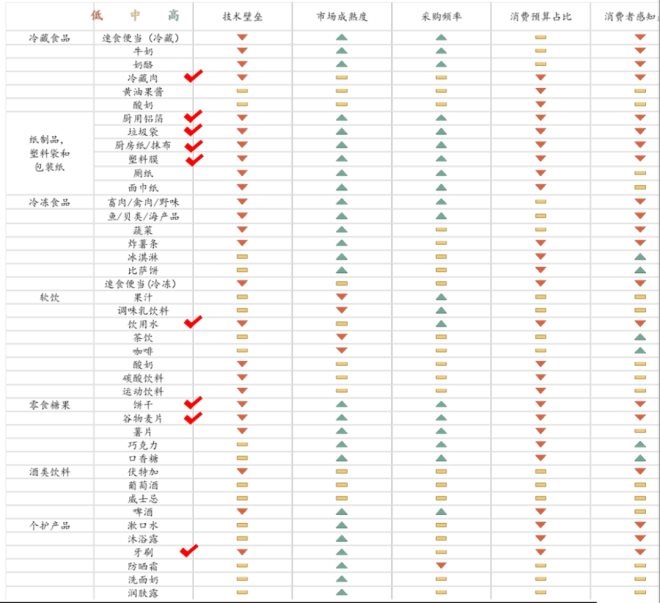 技術(shù)壁壘低,市場(chǎng)成熟,采購(gòu)頻繁,消費(fèi)預(yù)算占比大,感知差異小的替代性產(chǎn)品成為自有品牌發(fā)展的主要切入點(diǎn)。