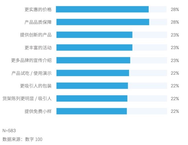 調(diào)研數(shù)據(jù)顯示,而在沒有購(gòu)買過自有品牌的消費(fèi)者中,有近9成(87%)的消費(fèi)者表示愿意嘗試購(gòu)買自有品牌:品質(zhì)保障(28%)、實(shí)惠的價(jià)格(28%)和創(chuàng)新的產(chǎn)品(23%)能提升他們的轉(zhuǎn)化率。