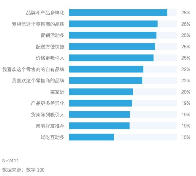 在被問到選擇零售商的原因時(shí),“品牌和產(chǎn)品多樣性”成為消費(fèi)者選擇零售商的首要原因,比促銷活動(dòng)多、配送方便、價(jià)格吸引人等因素高出3個(gè)百分點(diǎn),說明差異化是影響消費(fèi)者選擇零售商的最主要原因。