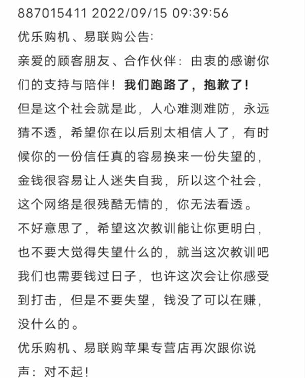網(wǎng)傳的一份優(yōu)樂購機和”易聯(lián)購“發(fā)布聯(lián)合跑路聲明稱:“我們跑路了,抱歉了!就當(dāng)這次教訓(xùn)吧,錢沒了可以在賺,沒什么的”引起網(wǎng)友熱議,也被眾多大V轉(zhuǎn)發(fā)。