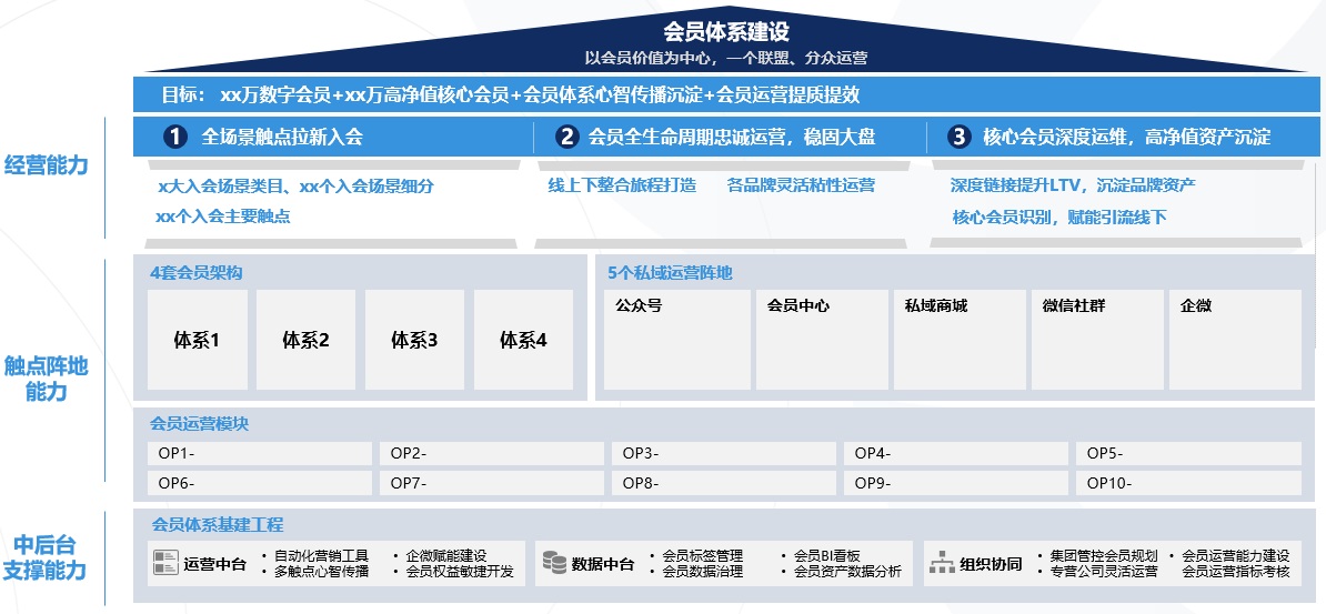 從廣義上來說,會員運營需要結(jié)合品牌的商業(yè)模式、運營、產(chǎn)品、服務、品牌、體驗設(shè)計等內(nèi)容。從落地角度來說,則需要共同構(gòu)建一個目標,例如會員數(shù)、高凈值會員、會員活躍度等,并且做好會員運營的三種能力建設(shè):