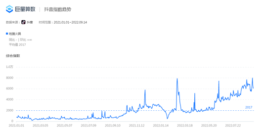 港式地?cái)偞蜻厾t也是近年來比較火的一個(gè)細(xì)分火鍋品類,雖然和地?cái)偦疱、蹺腳牛肉的熱度無法相提并論,但上升的趨勢比較明顯,巨量算數(shù)的抖音搜索指數(shù)從去年起至今逐漸上升至峰值。