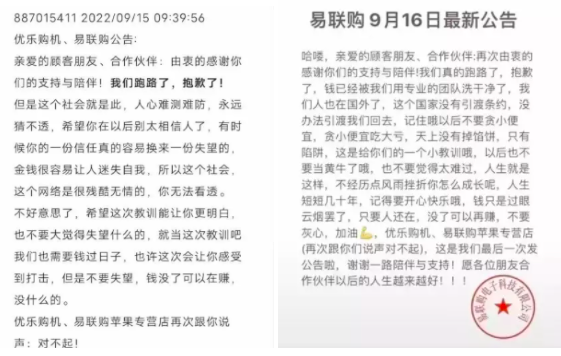網(wǎng)傳易聯(lián)購跑路公告,優(yōu)樂購機負責人對媒體稱“這是假的”