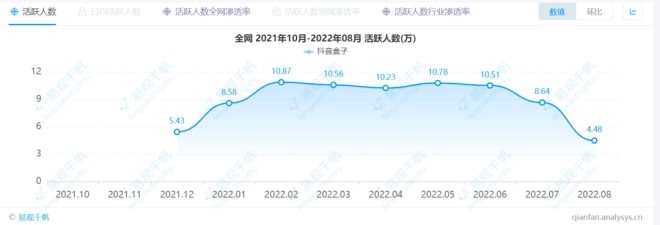 易觀千帆數(shù)據(jù)顯示,截止2022年8月,抖音盒子上線以來(lái)全網(wǎng)月活躍用戶(hù)數(shù)據(jù)從未突破11萬(wàn),在2022年2-5月這5個(gè)月時(shí)間中,抖音盒子維持了10萬(wàn)多的月活躍人數(shù),但從6月以來(lái),全網(wǎng)月活躍人數(shù)便急劇下滑,在8月的全網(wǎng)活躍人數(shù)更是跌破上線當(dāng)月的數(shù)據(jù)。反觀抖音,月活躍用戶(hù)數(shù)據(jù)在7億上下波動(dòng)。二者差距可謂云泥之別。